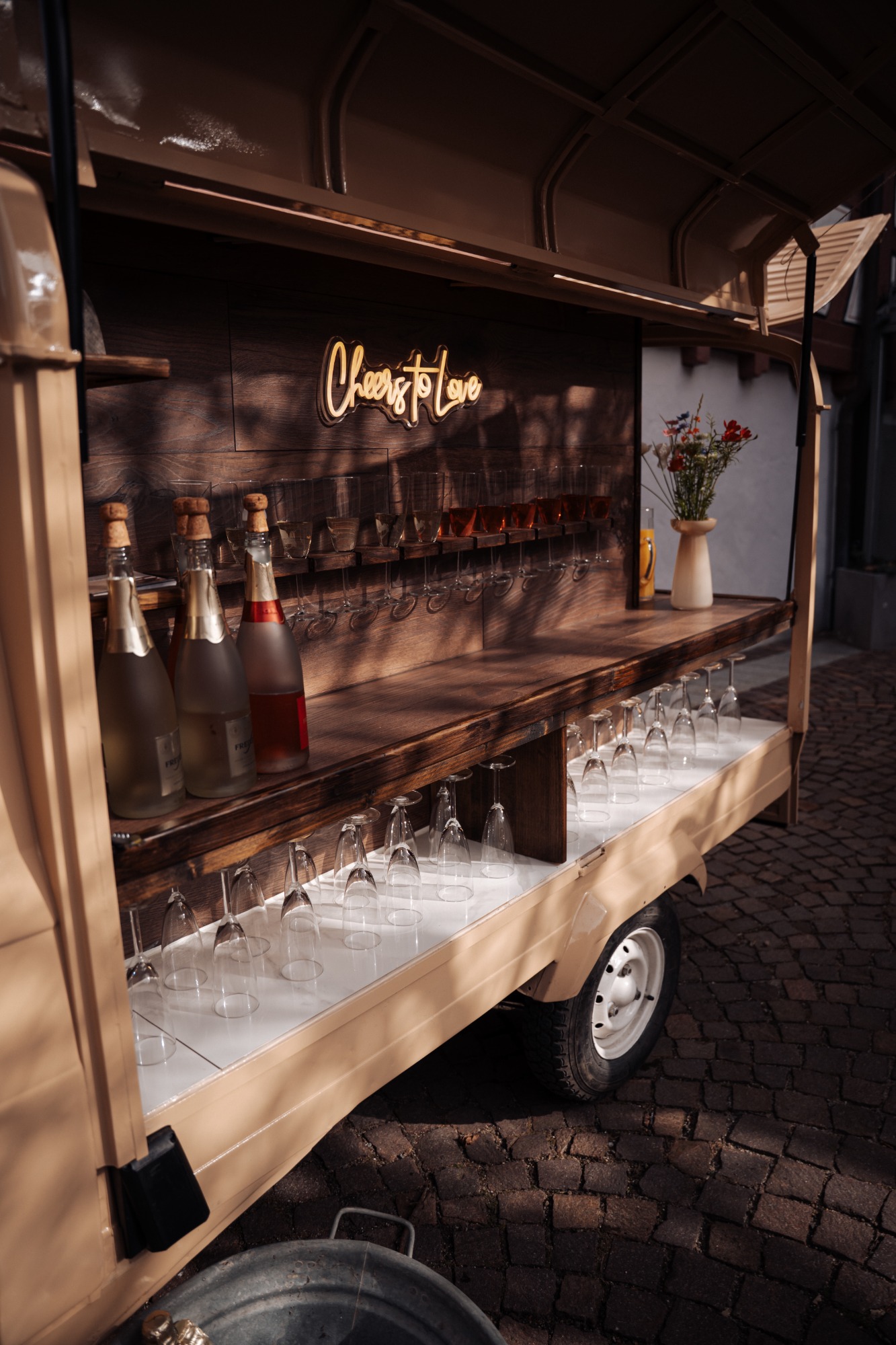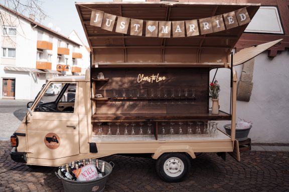 Wir sind Alisa und Florian, verheiratet seit Mai 2021. Wir haben eine kleine, italienische Piaggio Ape mit viel Liebe und Hingabe in eine elegante Mobil-Bar verwandelt.